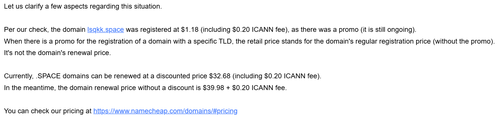 系统显示的续费价格不是12.59元,而是刺眼的二百七十多元。我反复确认,甚至与客服进行了交涉,得到的回复冰冷而格式化:页面显示的“Retail Price”仅代表无促销时的首年注册价,而非续费价格。当前.space域名的续费价格就是三十多美元,并无任何错误。